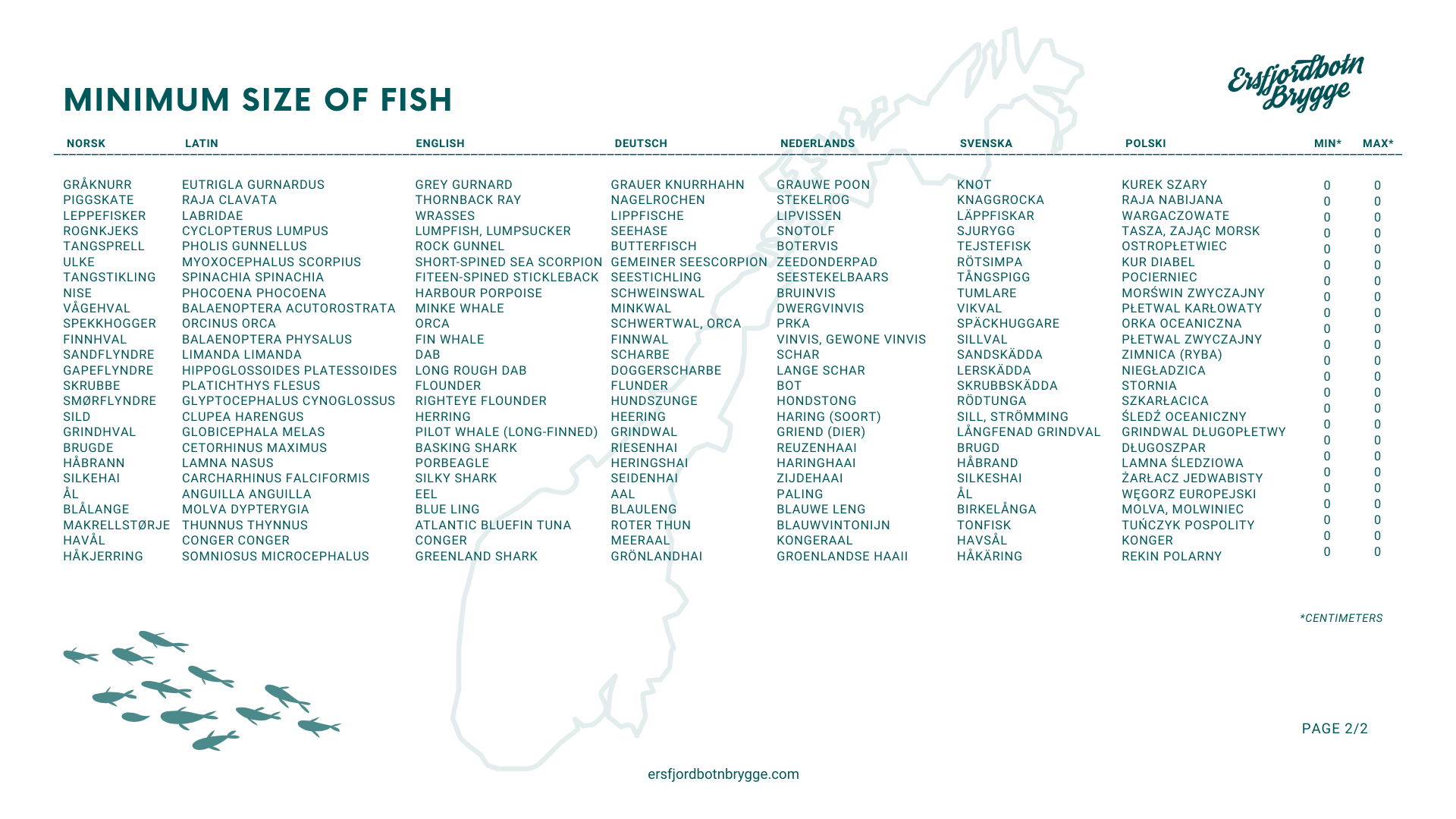 Study the minimum size tables below. Note that the following species are exempt: Coalfish, Mackerel, Ling, Pollack, Wolffish, and Tusk.